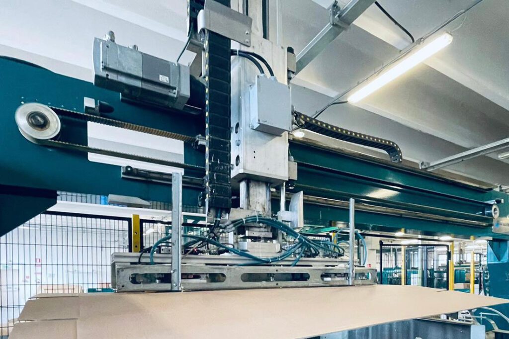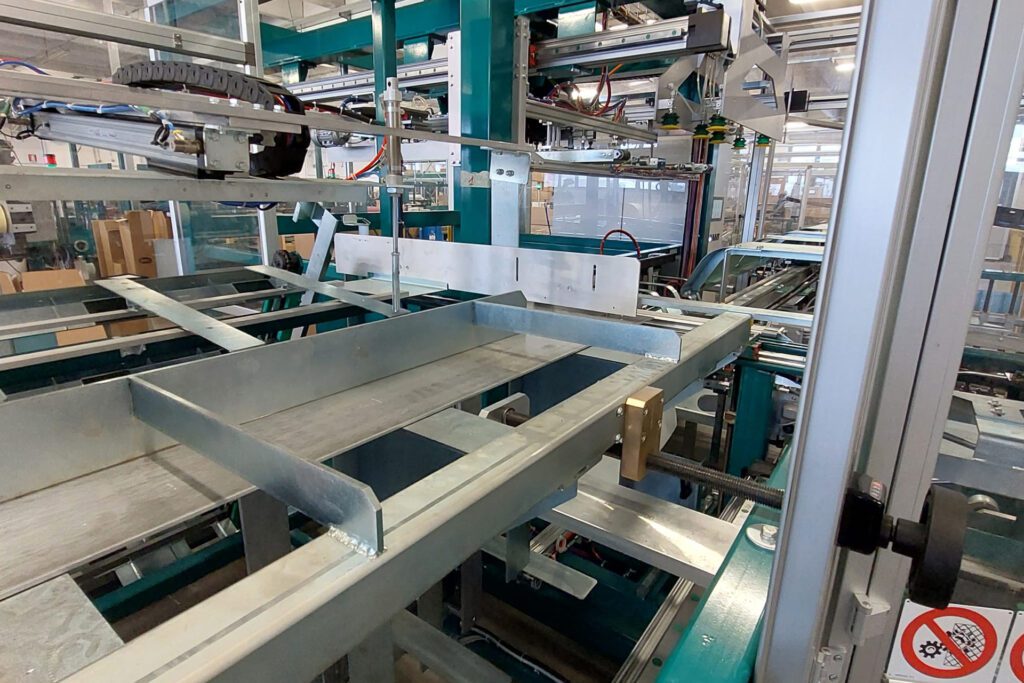 Les deux machines encartonneuses, situées en bout des deux lignes de production, emballent les nappes en rouleau dans des cartons unicolores, automatisant la création de la boîte qui est formée, remplie et fermée automatiquement. Les nappes défilent sur le convoyeur, les rouleaux sont comptés par la machine et empilés en couches qui sont placées dans la boîte en carton, qui une fois remplie et fermée est prête pour la palettisation et l’expédition. La troisième machine augmente l’automatisation de la confection des cartons assortis : les opérateurs placent les nappes de différentes couleurs dans des caisses qui sont acheminées vers la machine pour l’emballage de colis assortis, qui les emballe en les répartissant automatiquement dans les cartons, de sorte que chaque paquet contienne les nappes au nombre et mélange de couleurs prédéfinies.