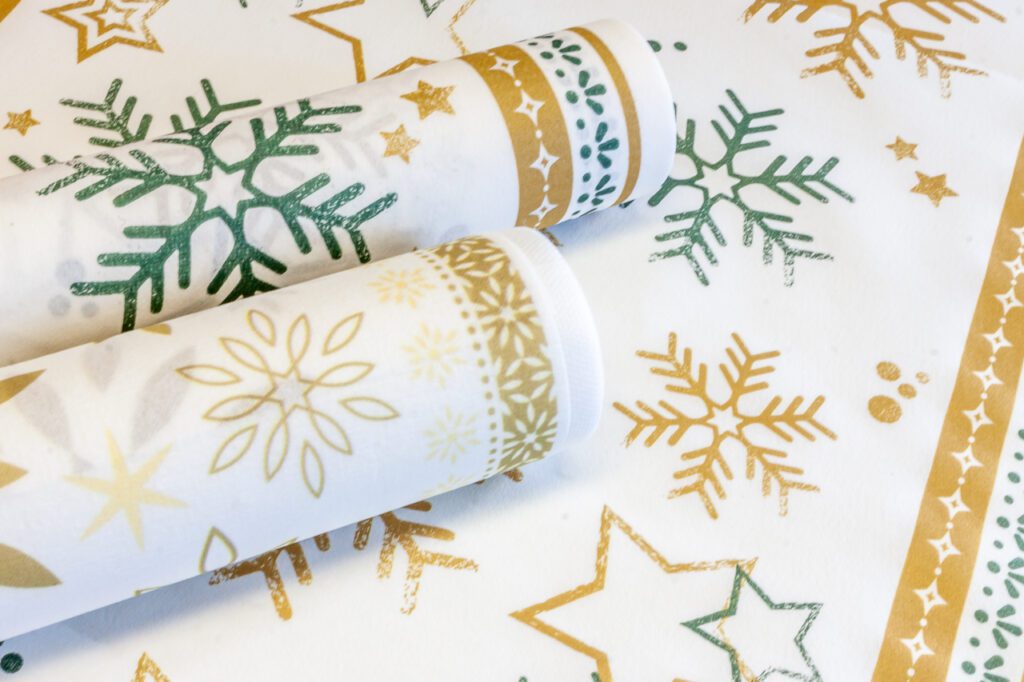 Notre gamme de Noël de linge de table jetable comprend des nappes en rouleau et des nappes pliées en papier, teinté dans la masse ou imprimé avec des motifs de Noël, et en airlaid, un matériau à base de fibres de cellulose semblable au tissu, élégant, résistant et agréable au toucher. Les chemins de table sont également disponibles en airlaid, pour une table moderne et tendance. La largeur des nappes, jusqu’à 140 cm, permet une chute classique et élégante sur tout type de table. Nos propositions pour les fêtes de fin d’année se concentrent sur des choix de couleurs de grand effet, comme l’or, l’argent, le rouge et le blanc, et de décorations de Noël, telles que des textures ou des dessins, dans un style moderne ou traditionnel. La créativité de nos designers et la qualité de la production Made in Italy donnent une touche originale et incomparable à nos collections de Noël de nappes et chemins de table jetables au style italien raffiné.