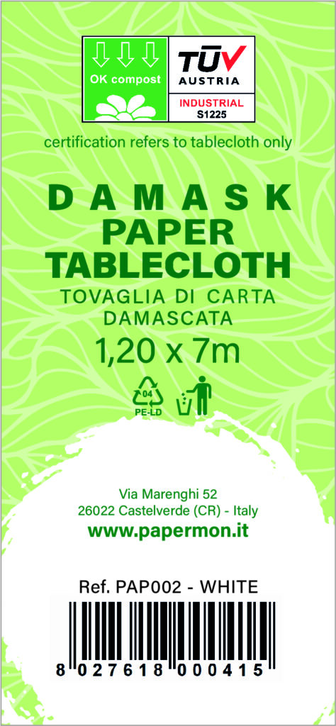 La personnalisation de notre linge de table jetable ne se limite pas aux décors et aux imprimés. Tous nos produits peuvent être fabriqués avec des mesures personnalisées. Les nappes en rouleau et les chemins de table sont également disponibles avec des pré-coupes sur mesure, pour une polyvalence d’utilisation maximale – les nappes peuvent devenir des chemins de table et les chemins de table des sets de table – à utiliser également combinés. Même l’emballage de notre linge de table est réalisé sur mesure pour mettre en valeur le produit de la marque et faciliter sa présentation en point de vente. Design, personnalisation et praticité sont pensés pour obtenir une visibilité maximale. Les possibilités de personnalisation incluent des cartons assortis: un seul présentoir pour les produits avec des couleurs ou des imprimés différents, parfait pour le canal de vente au détail, pour offrir des combinaisons tendance avec une seule référence de produit, et le carton prêt à vendre: pratique et polyvalent, disponible également avec une ouverture facile et une étiquette personnalisée, prête à être exposé. Nous offrons des conseils ciblés pour le développement d’un étiquetage personnalisé de nos produits de marque privée avec la marque du distributeur ou du revendeur.